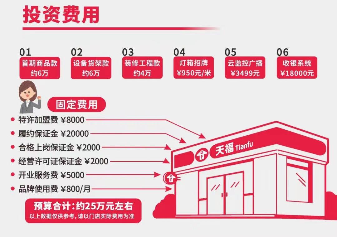 天福投資總額以門店具體情況為準,一般在25萬元左右: