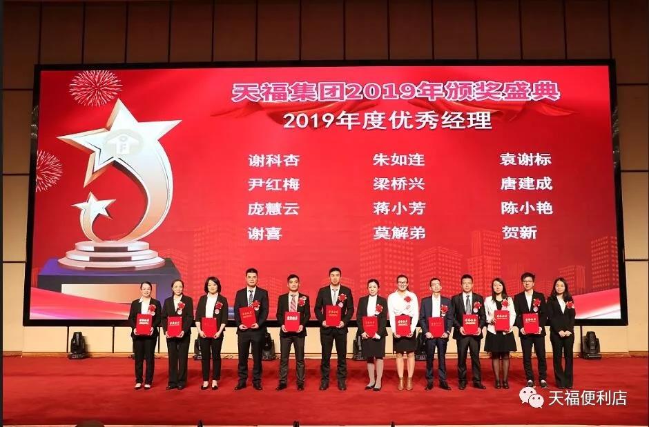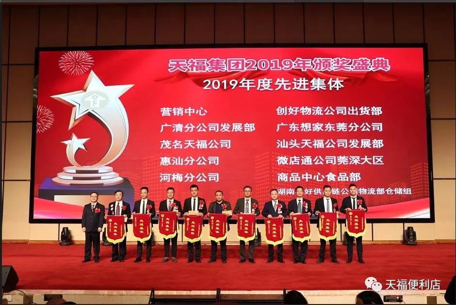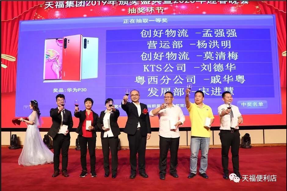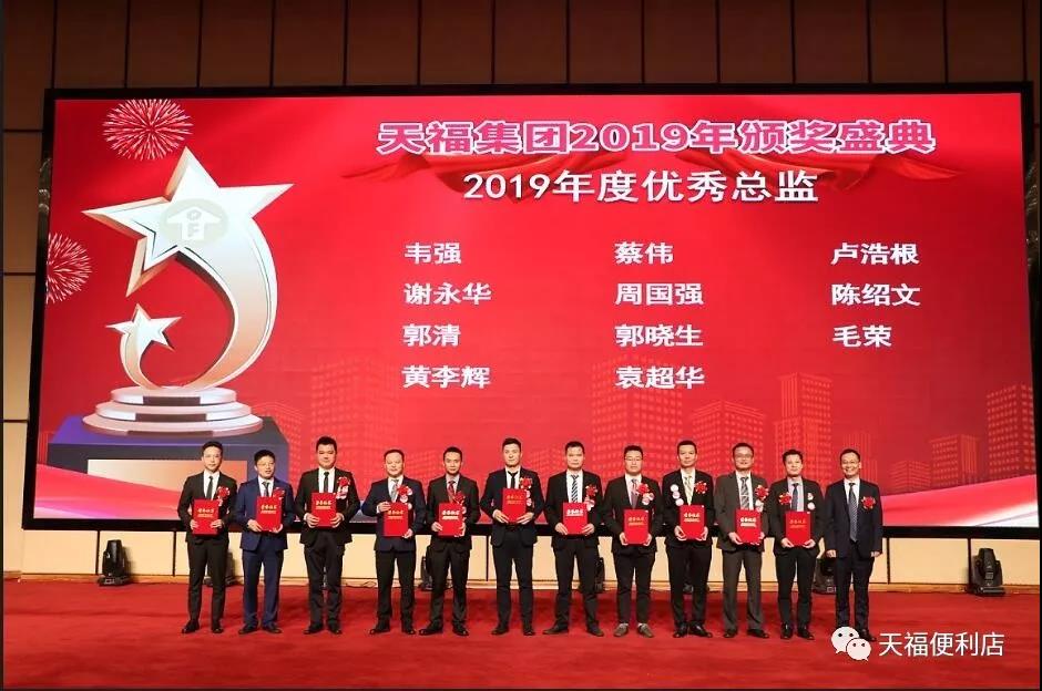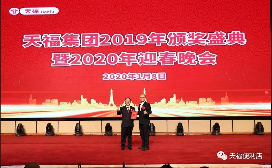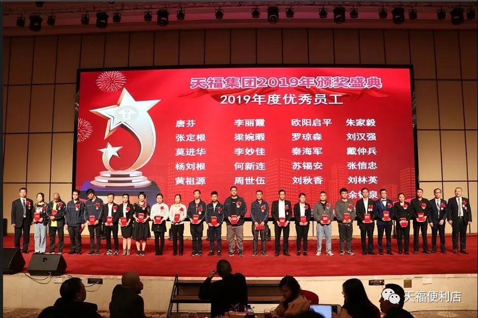 晚上6時許,天福集團2019年頒獎盛典暨2020年迎春晚會在國際宴會廳盛大舉辦。集團總裁室成員在會場門口列隊歡迎先進集體和優秀員工進場,集團常務副總裁成世恩宣讀了表彰決定。大會表彰了11個先進集體、10個創新案例獎、50名優秀管理人員、76名優秀員工和81名年度標兵。