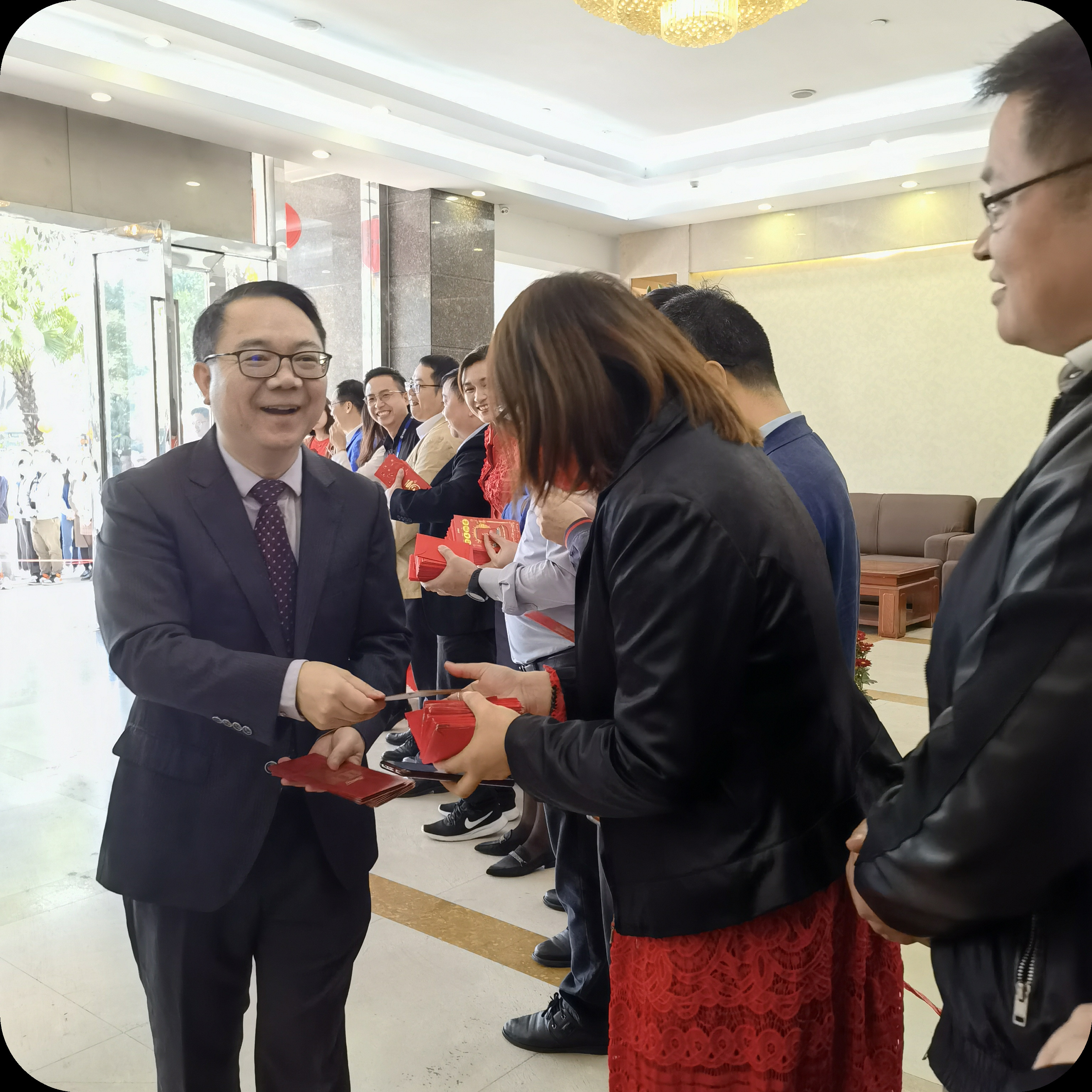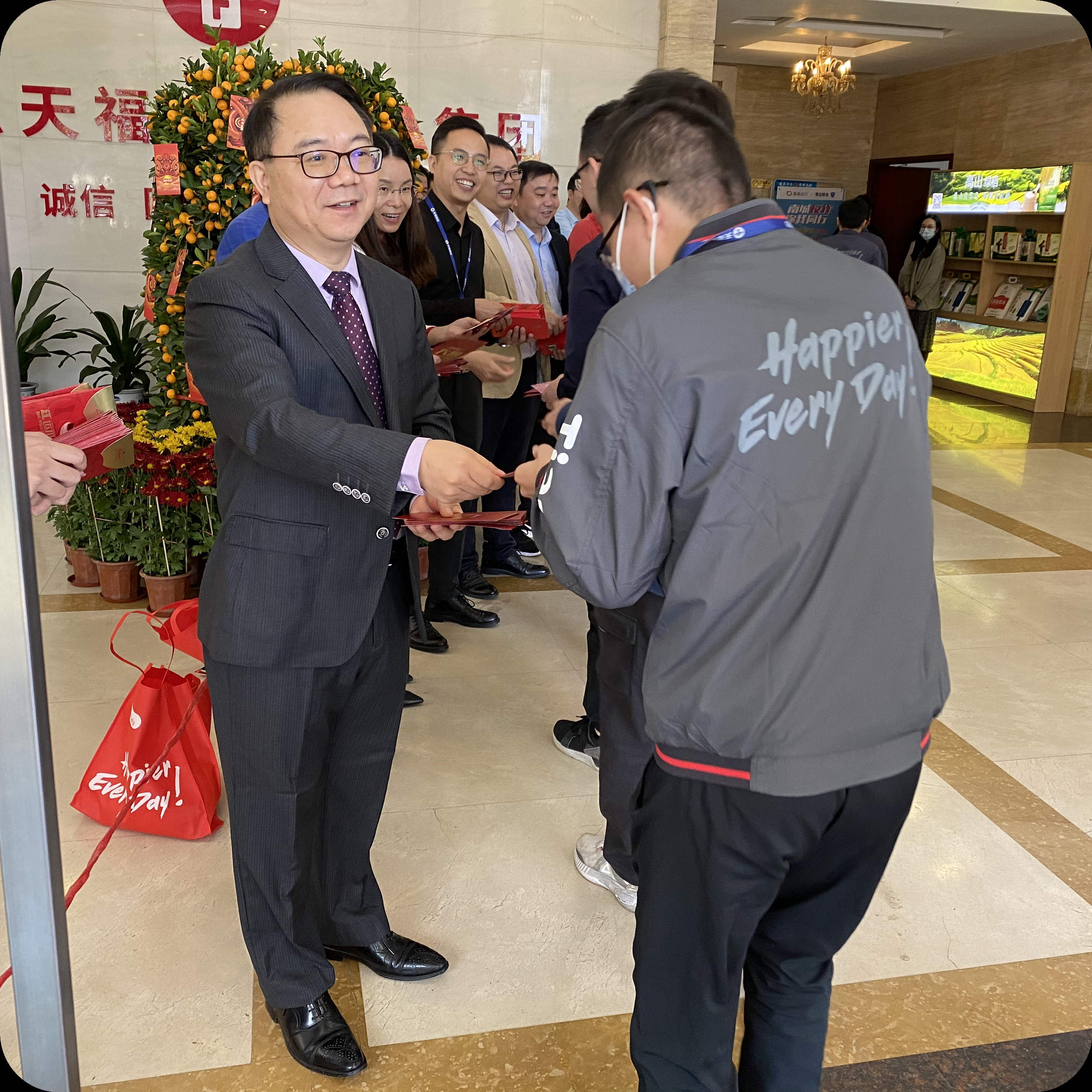 大年初六,天福集團公司組織總部辦公同事在天福大廈舉行了一場別開生面的“逗利是”開工儀式。天福集團董事長兼總裁歐陽華金先生攜領導班子與總部員工共賀新年,送上新春祝福,派發(fā)新年利是。